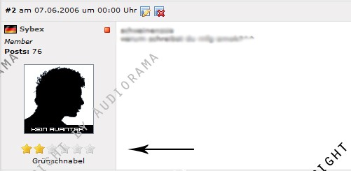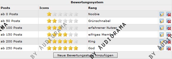 Mit diesem Mod lassen sich Ränge definieren, die ab einer bestimmten Anzahl von Forenposts erreicht werden können. Zu dem Rang selber werden eine für den Rang definierte Anzahl an Icons (hier Sterne) angezeigt, welche für einen Admin bzw. Forenmoderator auch in einer anderen Farbe dargestellt werden kann. Einstellbar ist das ganze bequem über einen neuen Eintrag im Adminmenu.