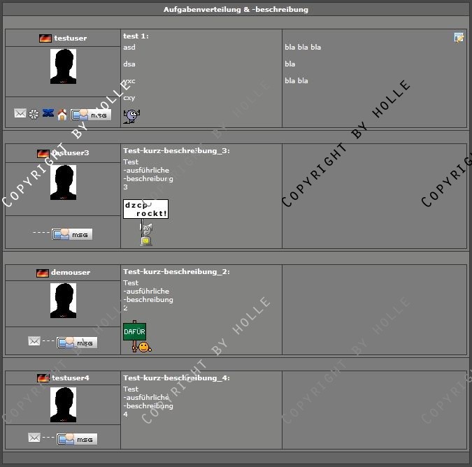 Nachdem mich meine Member mehrmals darauf angesprochen haben, wo & wie man denn einen Admin oder Zuständigen für einen bestimmten Bereich im Clan erreichen kann, bin ich auf die Idee gekommen, diese Übersicht dazu zu coden.